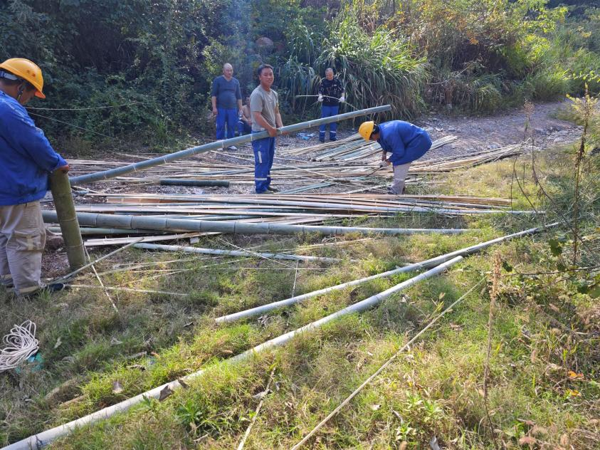 在爆破前的準(zhǔn)備階段,生產(chǎn)礦長(zhǎng)與生產(chǎn)技術(shù)員從10月17日起便查閱論文、制圖分析和研究探討,最終于10月28日敲定了孔網(wǎng)參數(shù)、裝藥結(jié)構(gòu)和起爆方式,并同步安排開(kāi)始穿孔作業(yè)。緊接著,11月3日,鑿巖班組及現(xiàn)場(chǎng)管理人員在礦山外進(jìn)行砍毛竹、劃竹片以便于后續(xù)裝藥工作。