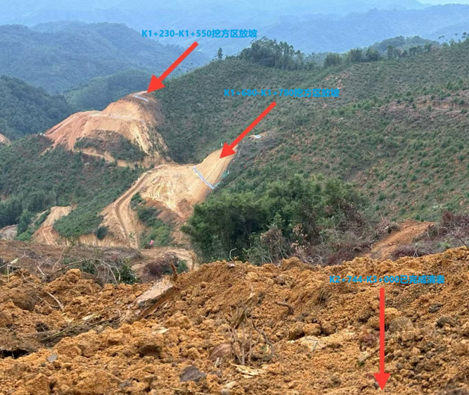 運(yùn)礦道路總設(shè)計(jì)長(zhǎng)度為3885米,現(xiàn)已完成清表1681米,剩余2204米未清表。道路大面積為挖方工程,現(xiàn)已貫通路面開(kāi)始挖方放坡,挖方區(qū)K1+230-K1+280設(shè)計(jì)為兩級(jí)坡,已放坡到路面高程,K1+300-K1+350設(shè)計(jì)為三級(jí)坡現(xiàn)已放坡到3級(jí)坡坡頂,K1+420-K1+550設(shè)計(jì)為三級(jí)坡現(xiàn)已放到3級(jí)坡坡頂位置,K1+680-K1+780設(shè)計(jì)為兩級(jí)坡,現(xiàn)已放坡到離地面6米高程。