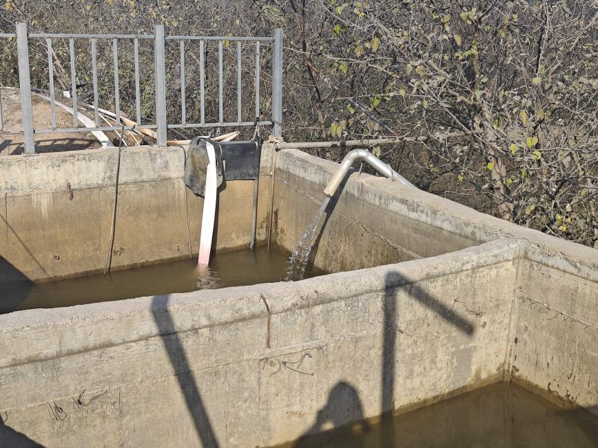 備用水泵到達(dá)水庫后,第一、二組人員再次分工。一人開車前往蓄水池電箱負(fù)責(zé)開關(guān)電源及調(diào)節(jié)感應(yīng)器,其他人員則在水庫對備用水泵進(jìn)行檢測、重新連接葉輪、水管、電源和和調(diào)試。最終,備用水泵于下午3:54成功接通并恢復(fù)使用。