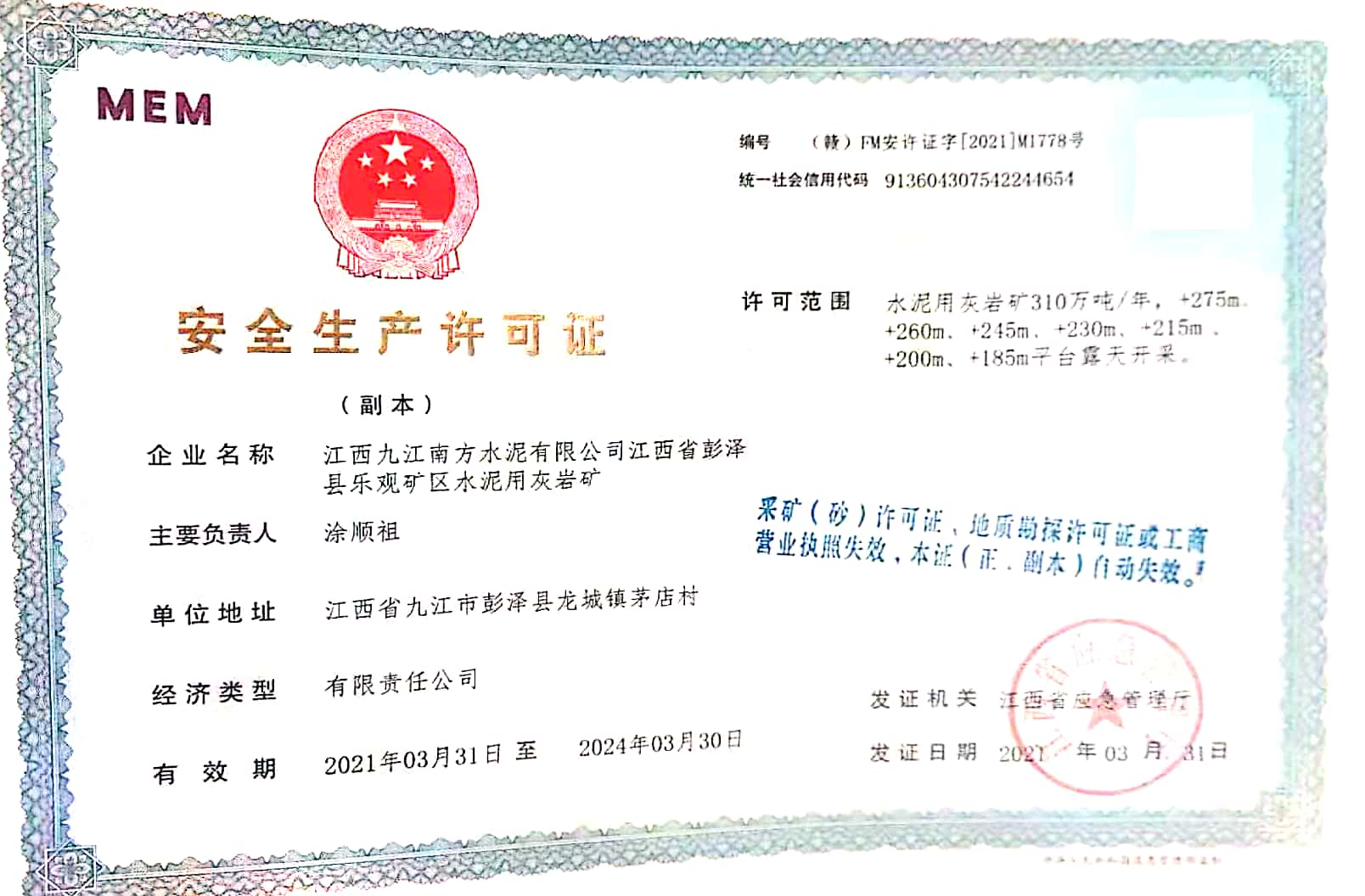 2021年3月31日,由江西省應急管理廳簽發(fā)的《安全生產(chǎn)許可證》如期而至,標志著九江礦安全生產(chǎn)進入新的篇章,未來九江礦會一直遵循公司“安全、環(huán)保、質量、產(chǎn)量、效益”十字方針開展生產(chǎn)工作,越做越好。